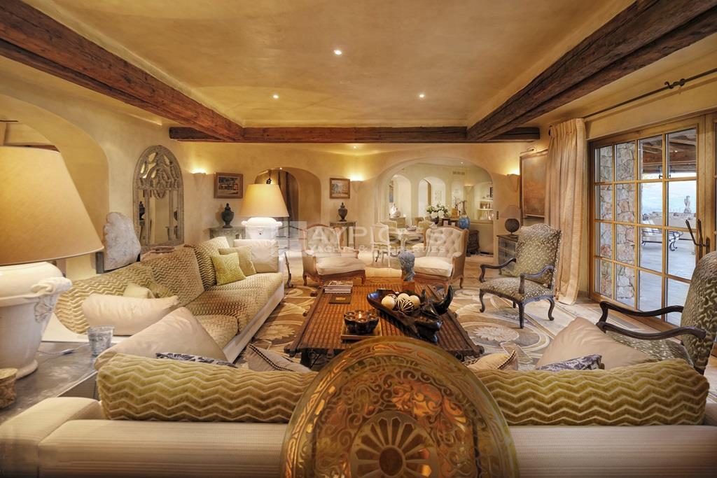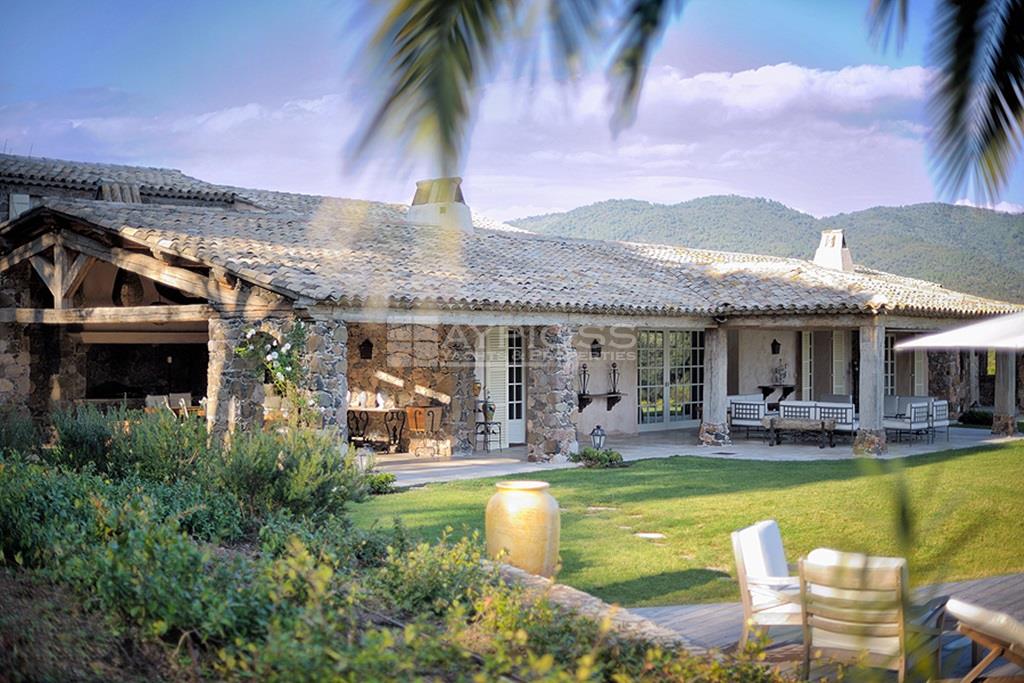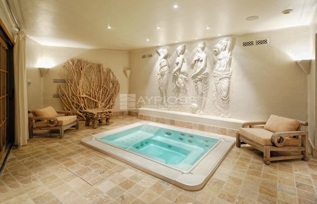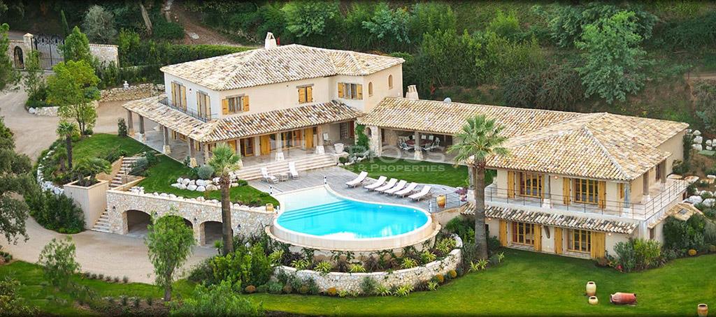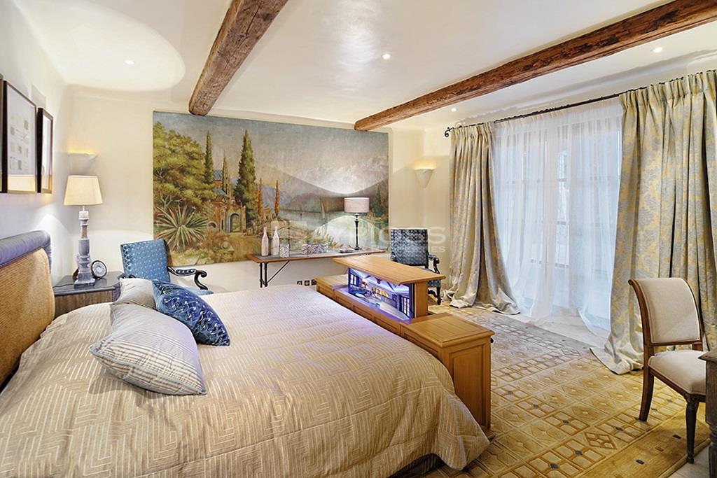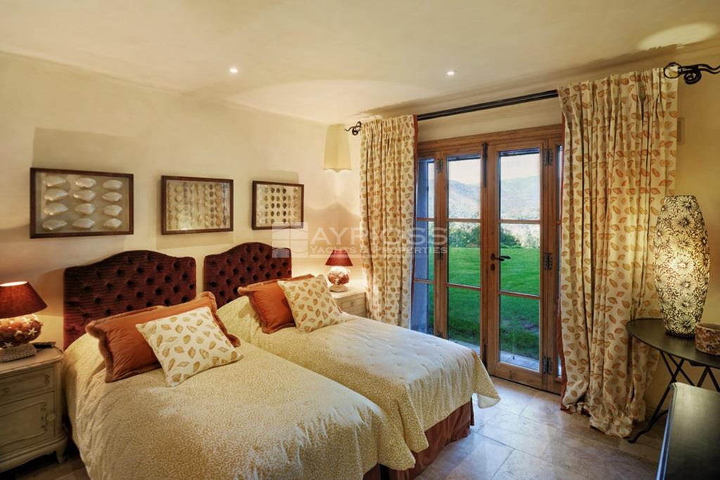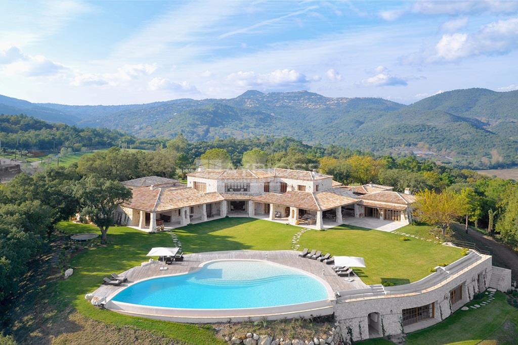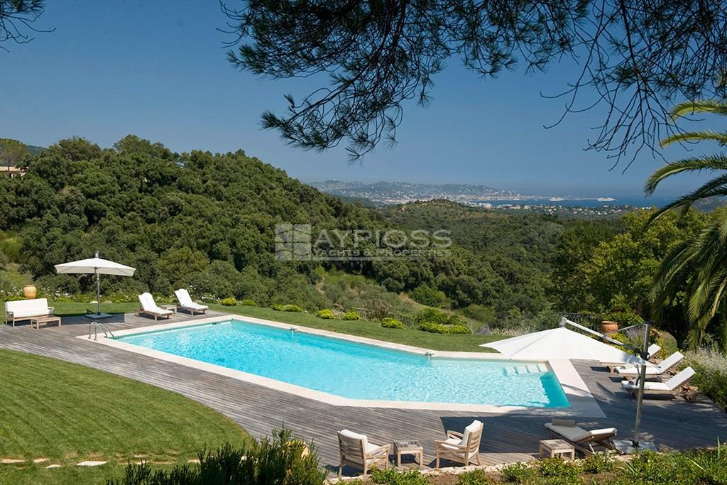 On a park of 30ha overlooking the bay of Cannes with panoramic views on the sea and the Esterel with the Alps in the background, this exceptional private property comprising 3 independent villas with luxury equipment and decoration welcomes comfortably up to 34 guests. Each villa has its own private heated swimming pool and the domain comprise a tennis, a 9.000m2 lake, 6ha of landscaped gardens and several pedestrian circuits across the property. The main villa offers several reception rooms opening onto large exterior covered terraces, an equipped office, a large kitchen with pantry, a wellness center with spa, steam room, sauna and fitness equipment, a disco with saloon, bar and pool table, 4 double suites and a master apartment on the upper level with bedroom, saloon, dressing, bathroom and private terrace with sea view, as well as 2 staff bedrooms. The second villa is also set with saloon, dining room, a large kitchen and 5 bedrooms with en-suite bathroom, 3 being in an independent aisle with a little saloon and kitchenette and a staff bedroom. The 3rd villa offers living rooms and office, a large equipped kitchen and 7 double or twin bedrooms with en-suite bathroom and a staff bedroom; Air-conditioning and audio-video equipment throughout the 3 villas; Caretaker in separated accommodations;